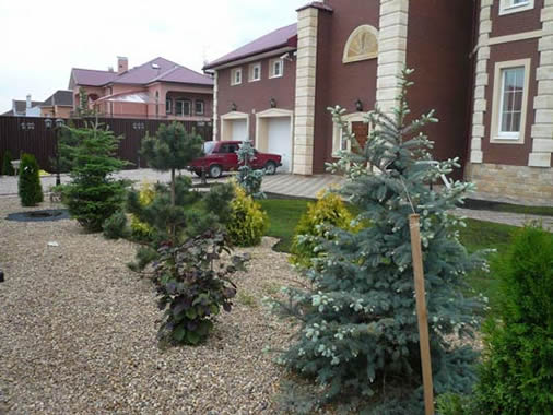 Торжественную атмосферу парадной части участка создают хвойные породы растений. Вся композиция построена на контрасте цветов и фактур растений. Отсыпка декоративным гравием под кронами растений не только декоративна - она значительно облегчает труд по уходу за участком.