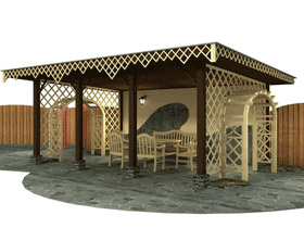 В отделке не используются дополнительные материалы. Декоративный эффект достигается за счет контраста светлых и темных тонов, использованных при покраске дерева. Арочная двухъярусная крыша придает конструкции легкость и изящество |