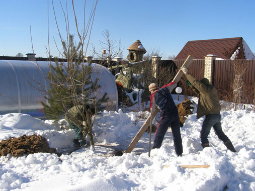 Посадка крупномерного дерева в подготовленную яму.