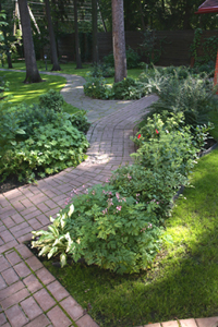 При создании генерального плана озеленения эти особенности были учтены. В основу дизайна сада был положен пейзажный стиль, что подчеркивается извилистыми дорожками, вымощенными из природного камня. Практически все взрослые растения были сохранены, в том числе и доставшиеся по наследству от соседа великолепные взрослые колоновидные туи.