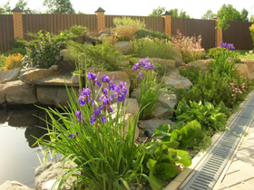 Вид на участок после проведения работ по благоустройству и озеленению. На берегу декоративного водоёма расцвели яркие сибирские ирисы. |
